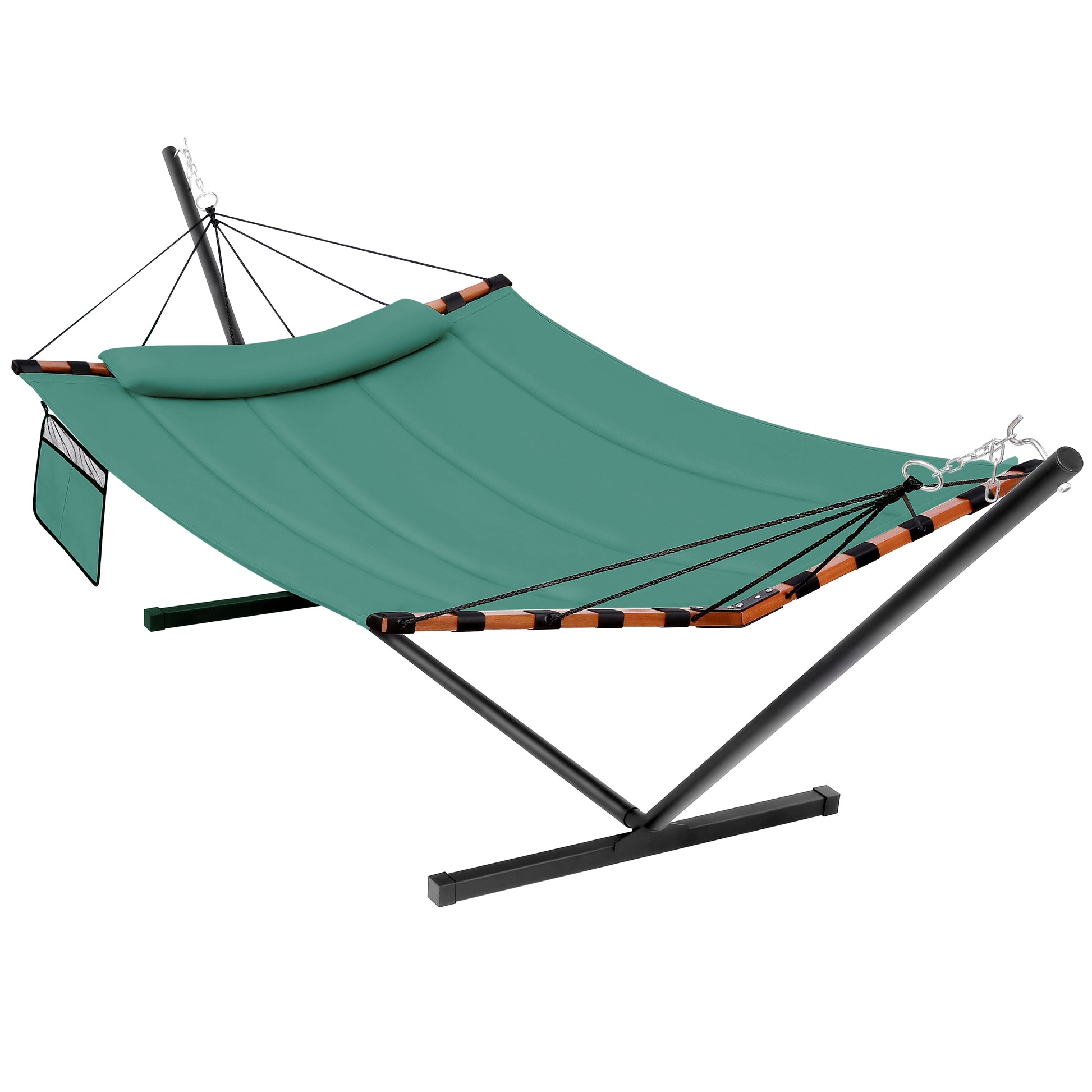 - ★Super Large Hammock: 55in width x 79in length large hammock bed can easily accommodate 2 people to enjoy the leisure time simultaneously (maximum 450lb capacity). The pillow is lengthened to 35.4in for two people. Besides, the hammock comes with a detachable side pocket for phone, books, cups and other stuffs for your convenience.