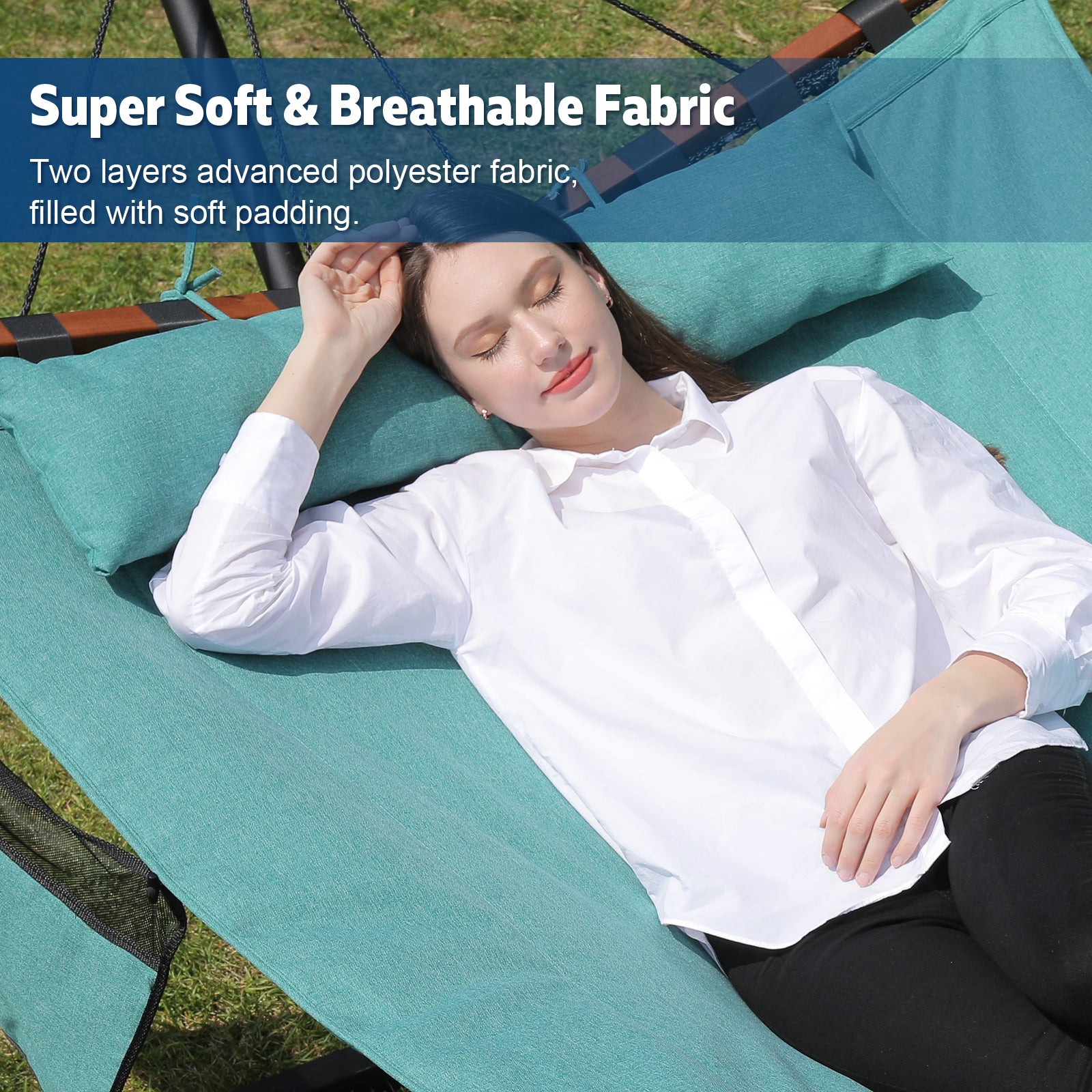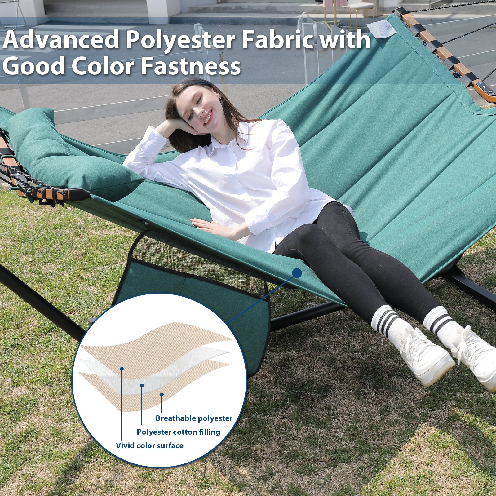 - ★Premium Weather-Resistant Polyester Fabric: Two-layer quilted fabric hammock, filled with soft padding. Resting on our hammock for a moment feel like laying on the cloud. After strict selection, we use a kind of premium polyester fabric for our hammock which has better color fastness and brings you more comfortable feeling.
