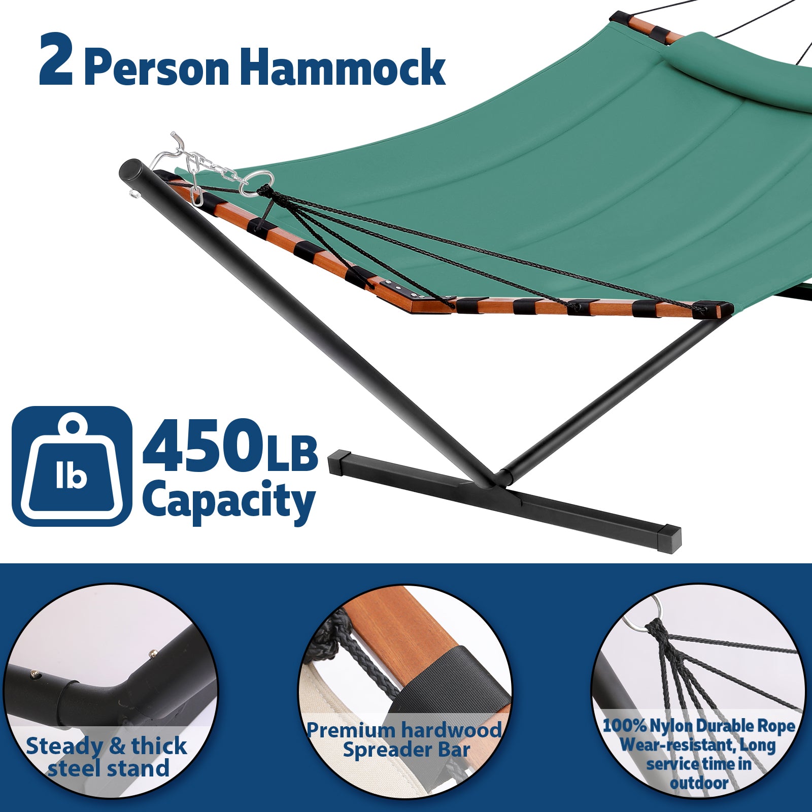 TegerDeger 12FT 2 Person Hammock with Stand Included 55 x 79IN Large Hammock 450LB Capacity with Hardwood Spreader Bar & Nylon Rope for Outside, Patio, Garden, Backyard, Beach, Poolside - Lake Blue